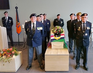 7 februari waren wij met de familie samen in De Oude Hage voor de uitvaart met bondseer. Na het signaal Taptoe en het brengen van de eregroet is de baar met Arie door ons begeleid naar de rouwauto. Hier hebben wij met de familie afscheid van hem genomen.